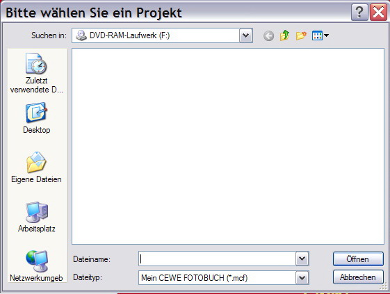 Schritt für Schritt: 1. Ich aktiviere in Daemon Tools oder Nero Imagedrive ein virtuelles Laufwerk, lade darin ein bestelltes Projekt cewe.iso 2. Ich starte die Anwendung 4.8.4 bzw. 4.8.3. Im Menü "Datei" werden mir 2 alte Projekte angeboten 3. Ich benutze "anderes Projekt öffnen" und öffne so die data.mcf aus dem virtuellen Laufwerk 4. Nach dem Laden des Projektes erscheint das neue Projekt als drittes Projekt im Menü "Datei". Nun schließe ich die Anwendung mit dem Kreuz in der Kopfleiste ganz rechts oben 5. Ich werfe die cewe.iso aus dem virtuellen Laufwerk (Entladen, auswerfen), erhalte aber das Laufwerk, d.h. ich deaktiviere das Laufwerk nicht (ein reales Laufwerk würde ja auch nicht verschwinden). 6. Ich starte die Anwendung erneut, gehe in "Datei". Alle Einträge alter Projekte sind nun verschwunden! 7. Ich gehe auf "anderes Projekt öffnen", es erscheint sofort als erstes die eingangs beschriebene Aufforderung, eine CD in das virtuelle Laufwerk einzulegen! 8. Ich quittiere mit "Abbrechen". Nun gelange ich in das reguläre Browserfenster zur Auswahl eines neuen Projektes, wie oben von @Charlie gezeigt. Ich breche jedoch auch diese Eingabe ab und schließe die Anwendung. 9. Ich starte die Anwendung ein drittes Mal. Tatsächlich bleiben weiter alle alten Projekte verschwunden (warum das gestern nicht so war, weiß ich nicht, vielleicht Testfehler von mir). Wiederum kommt bei "anderes Projekt öffnen" die Aufforderung, die CD einzulegen. Diesmal quittiere ich nur die Aufforderung, wähle dann aber ein existierendes Projekt aus. 10. Ich beende die Anwendung nach dem Laden des Projektes. 11. Ich starte die Anwendung ein viertes Mal. Diesmal ist das zuletzt geöffnete Projekt im Angebot. Benutze ich nun "anderes Projekt öffnen" kommt die Aufforderung, eine CD einzulegen, nicht mehr. Nun funktioniert wieder alles wie gewohnt - nur die Links auf die alten Projekte sind halt dauerhaft aus dem Menü "Datei" verschwunden. Re: Überflüssige AufforderungHelprich hat geschrieben: wieder eine Gemeinsamkeit und doch so unterschiedliche Ergebnisse?