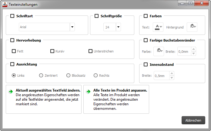 Um Einstellungen in den verschiedenen Optionen wie Schriftart oder Ausrichtung vorzunehmen, müssen Sie zunächst einen Hacken in dem Kästchen vor der Überschrift setzen.