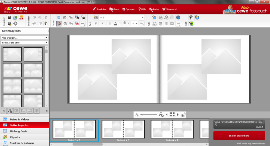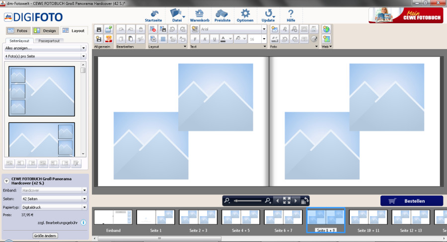 Rotuma hat bereits ausführlich die Einstellungsmöglichkeiten des Hintergrundes ergänzt. Gerade bei Passepartous ist es natürlich angenehmer einen dunkleren Hintergrund zu haben. Den Punkt mit den immer weniger werdenden Doppelseiten habe ich bei den Kollegen zur Diskussion gestellt. Interessant wäre vielleicht an dieser Stelle eine variable Einstellmöglichkeit der Vorschaugröße. Eine kleinere Vorschau ist durchaus sinnvoll, wenn man an großen Projekten arbeitet. Jedoch ist die größere Vorschau sicherlich auch für einige Kunden von Vorteil. Weitere Gespräche werden nun zeigen müssen, inwieweit sich eine Veränderrung im Storyboard umsetzten lässt. Und Hallo kuddelmuddel123, Ein solches Tool ist bisher nicht geplant, da für das anlegen solcher Layouts per Hand Hilfslinien und magnetische Lassos greifen. Je nach Anzahl und größe der Bilder, die Sie verwenden möchten, gibt es unter den Layoutvorlagen auch eine, die dem von Ihnen beschrieben Wunsch sehr nah kommt: Liebe Grüße