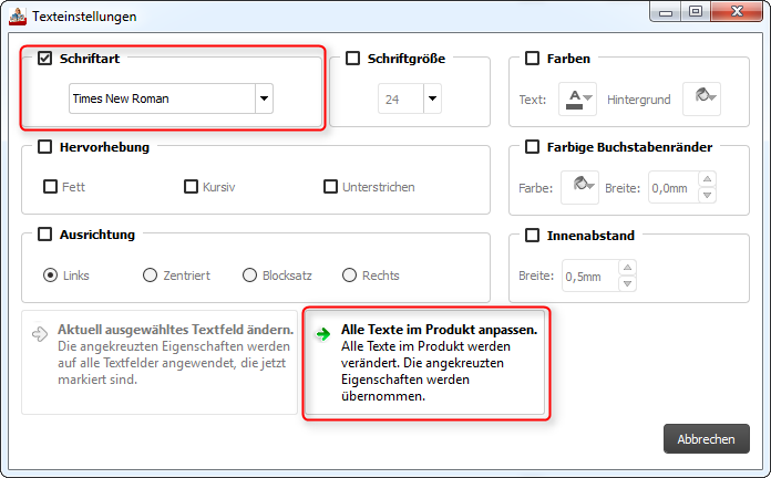 Die bei Ihnen angezeigte Fehlermeldung bezieht sich auf fehlende Schriftarten. Jedoch ist dies an dieser Stelle irreführend, da es sich bei MS Shell Dlg 2 um keine Schriftart handelt, sondern um einen Zuordnungsmechanismus von Microsoft. Wenn Sie ausschließlich die Schriftart Times New Roman in Ihrem Projekt verwenden, können Sie ein Auftauchen dieser Fehlermeldung und ein Verändern der Schrift dadurch verhindern, dass Sie alle Textfelder in Ihrem Produkt anpassen. Dafür gehen Sie in die erweiterten Texteinstellungen: Liebe Grüße