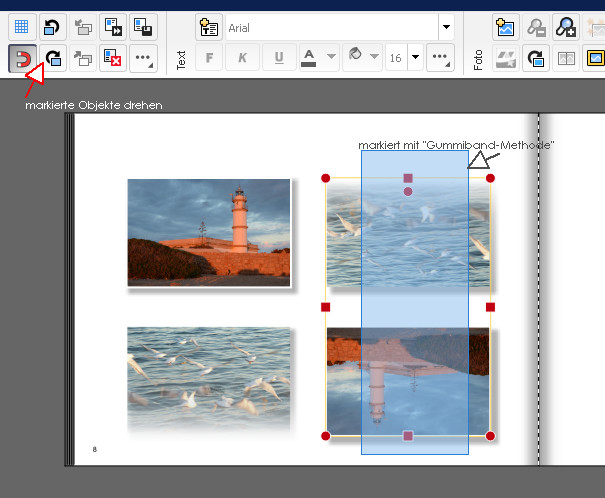 Hier mal ein Beispiel. Ich habe nur die halbe Seite gedreht zum besseren Vergleichen. Es funktioniert aber genauso mit einer ganzen bzw. einer Doppelseite. Evtl. muss man die Position der Fotos noch justieren, das kann man aber im Ganzen, sprich komplett markiert, machen.