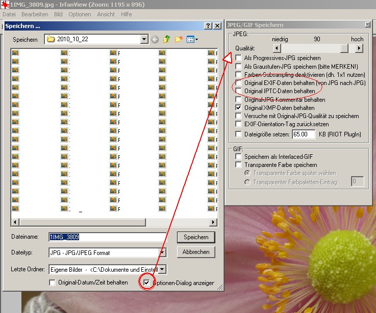 bei mir dauern die Übertragungen (vom Laptop per W-Lan) auch immer 2-3 Stunden. Die lasse ich laufen, wenn ich gerade nicht an den Laptop muss. Ich habe den Laptop in den Energieoptionen so eingestellt, dass er sich nicht ausschaltet in der Zeit und Abstürze gibt es bisher keine. Um zu wissen, warum das bei dir länger als bei deinem Bekannten dauert, müsste man mehrere Parameter vergleichen: Sind die Bücher vom Umfang ähnlich, habt ihr den gleichen Provider, zu welchen Zeiten übertragt ihr die Bücher? Ich habe hier je nach Tag und Uhrzeit sehr unterschiedliche Upload-Raten. Zu den Exif-Daten: Es gibt spezielle Programme, mit denen man Exif-Daten bearbeiten oder löschen kann. Ich kann jetzt keins nennen oder empfehlen, aber die kann man googeln. Im Rahmen der Größen-Bearbeitung deines Fotos für das Forum kannst du das aber auch gleich mit erledigen, z.B. mit irfanview. Beim Speichern deaktivierst du den Punkt "Original Exif Daten behalten" und weg sind sie. (Ggf. musst du vorher "Optionen-Dialog anzeigen" aktivieren) liebe Grüße