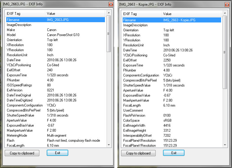 Re: Lange ÜbertragungszeitMit http://www.sno.phy.queensu.ca/~phil/exiftool/ kannst du die EXIF-Daten kopieren, löschen, ändern. Allerdings bedarf es einiger Einarbeitungszeit.