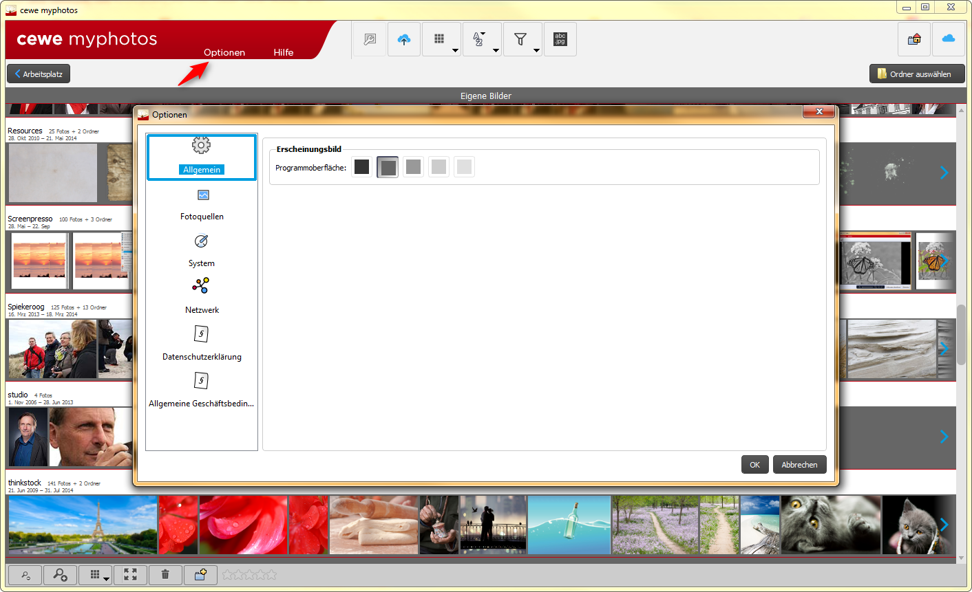 Mit der CEWE Fotowelt als großen Bruder möchte sich unsere cewe myphotos natürlich gerne einige Kleinigkeiten abschauen. Übernommen hat Sie das Optionsfenster, in dem Sie ähnlich wie in der Fotowelt einige Einstellungen vornehmen können.