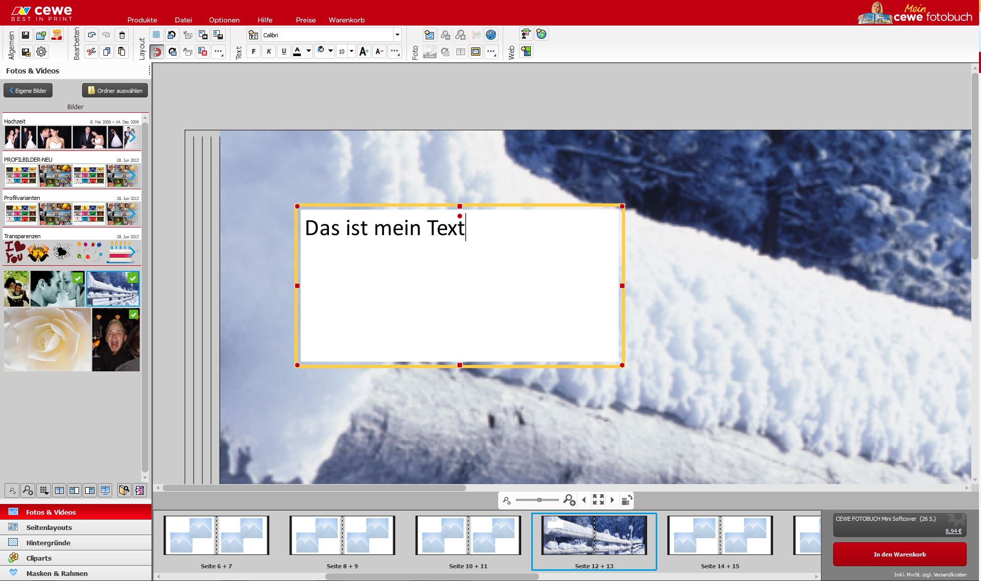 Da ich ja in der Regel Panorama-Format erstelle, ist meine Buch-Ansicht nicht so groß und da sind die Textfelder oft schwer zu bearbeiten. Mal ist der obere Drehknopf im Weg, mal einfach die Ansicht zu klein und wenn dann noch die Rechtschreibprüfung die Hälfte des Textes markiert, wird es richtig unübersichtlich. Ich würde mir folgende Arbeitsweise wünschen: Beim Neu-Erstellen eines Textfeldes wird ein Editor geöffnet, in den ich meinem Text eingebe und formatiere. Mit "Übernehmen" wird er ins Buch übernommen, wo ich ihn nur noch an die passende Stelle rücken und ggf. die Breite anpassen muss. Für Änderungen in einem bestehenden Textfeld möchte ich wahlweise direkt ins Textfeld schreiben können oder per Rechts-Klick ins Textfeld ein Kontextmenü öffnen und dort mit (z.B.) "Text im Editor bearbeiten" wieder den Editor öffnen können. Wahrscheinlich wäre auch ein "Vorschau"-Button interessant, damit man eine Vorstellung von der Schriftgröße und Textfeldgröße im Buch bekommt. Ich persönlich bräuchte das nicht (hab ja schon ein bisschen Erfahrung Ich würde mir auch wünschen, dass gleichzeitig die Rechtschreibprüfung dahingehend überarbeitet wird, dass bei einem zum Wörterbuch hinzugefügten oder ignorierten Wort die Unterstreichung gelöscht wird (Ausführlicher im Thema hier: http://www.cewe-community.com/forum/vie ... f=2&t=8739 behandelt). liebe Grüße