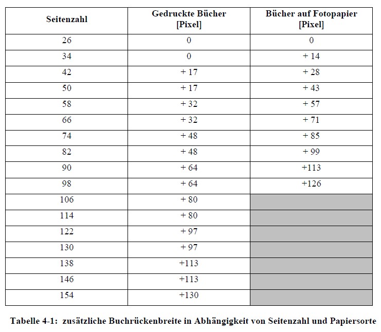 Es scheint so als läge allen Tabellen 300 dpi zugrunde; Da wäre bei mattem Papier der Buchrücken für 74 Seiten jetzt um fast 2 mm breiter als zu Zeiten der Tabelle 4.1.