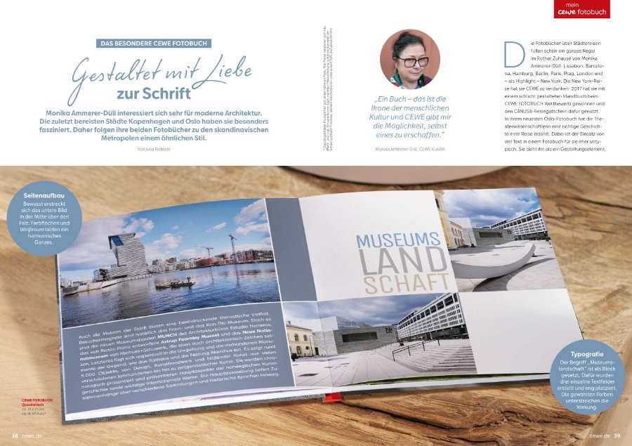 wie Ihr schon bemerkt habt, ist die CEWE Fotozeit 01/2025 draußen. Ihr könnt sie online hier anschauen. Ich habe Euch die Highlights einmal mitgebracht. Unser Community-Mitglied Marmuffin68, die besonders in den Kundenbeispielen sehr aktiv ist, wurde zusammen mit ihrem einzigartigen Gestaltungsstil, der ihre Bücher so besonders macht, vorgestellt. Für die unter Euch, die immer auf der Suche nach neuen Gestaltungsmöglichkeiten sind, sind die Tipps zu Strukturierung, Bildanordnung, Schriften, Farbwirkung und Cliparts & Formen spannend! Es wurde auch einmal auf die Events hingewiesen, bei denen Ihr CEWE live erleben könnt. Thorsten aus dem Webinar Team wird in Oberstdorf auch vor Ort sein. Viel Spaß beim Durchstöbern! Viele Grüße