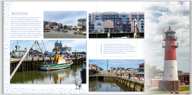 Seite Büsum: Probiere mal, wie es aussieht, wenn Du die gepunkteten Cliparts weglässt. Die beiden Foto´s würde ich nicht über den Falz setzen.