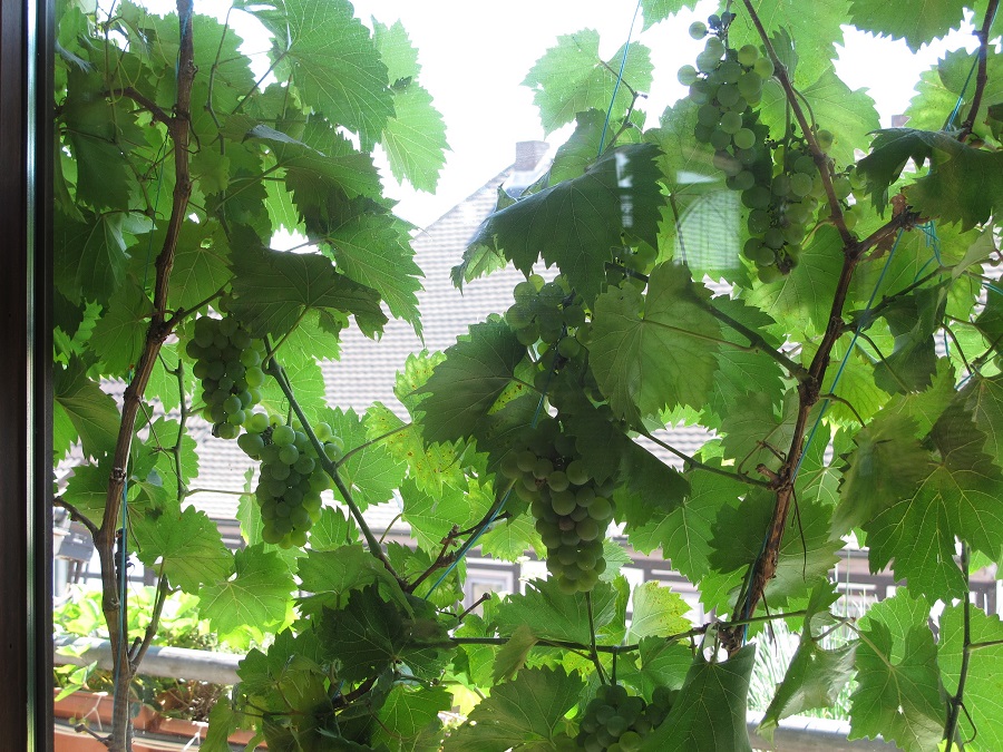 Also haben wir eine Weinrebe gepflanzt: Ausblick ins Grüne, kein "Durchblick" von außen nach innen , guter Schattenspender für das Wohnzimmer und im Spätsommer noch frische Trauben