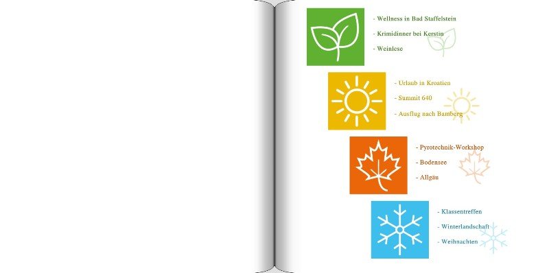 Mein erstes (vielleicht einziges) Jahrbuch, habe ich noch einmal überarbeitet und die etliche Seiten sind nun in der finalen Version fertiggestellt. Das Cover und die Kapitelöffner sind recht spartanisch gehalten. Für die einzelnen Ereignisse, Erlebnisse, habe ich dagegen eine abwechslungsreiche und farbenfrohe Gestaltung gewählt.