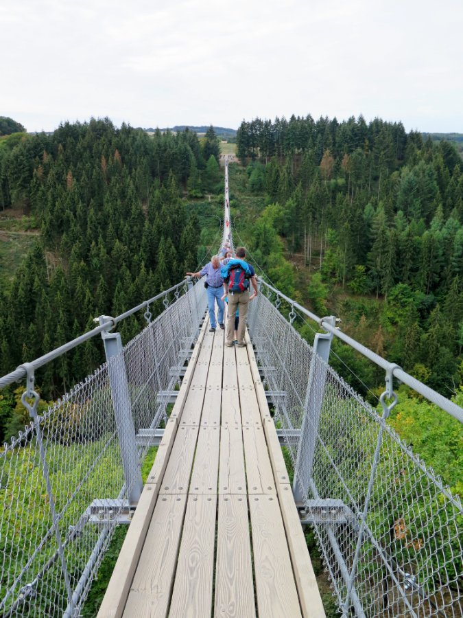 Hier zunächst die Geierlay im Hunsrück, wo sie das Mörsdorfer Bachtal überquert. Ihre Maße? Länge 360 m, Höhe über dem Boden ca. 100 m. Liebe Grüße