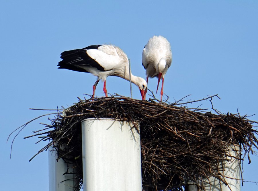 Für mich die ultimativen Frühlingsboten: Störche.Zwar bleiben zwischenzeitlich auch einige hier, damitsie im frühjahr schneller loslegen können und schon ihre Horste im Besitz haben, wenn die anderen Störche zurückkehren, aber die beiden hier fotografierten Störche waren im Winter weg und ich war live dabei, als sie kurz hintereinander zurückgekommen sind.