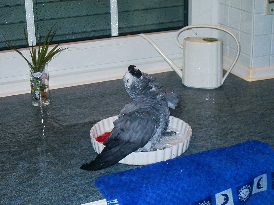 Unsere beiden Graupapageien beim Baden, auf mir sitzend auf's Futter wartend und als bekennender Hasser der damaligen Rechtschreibreform...