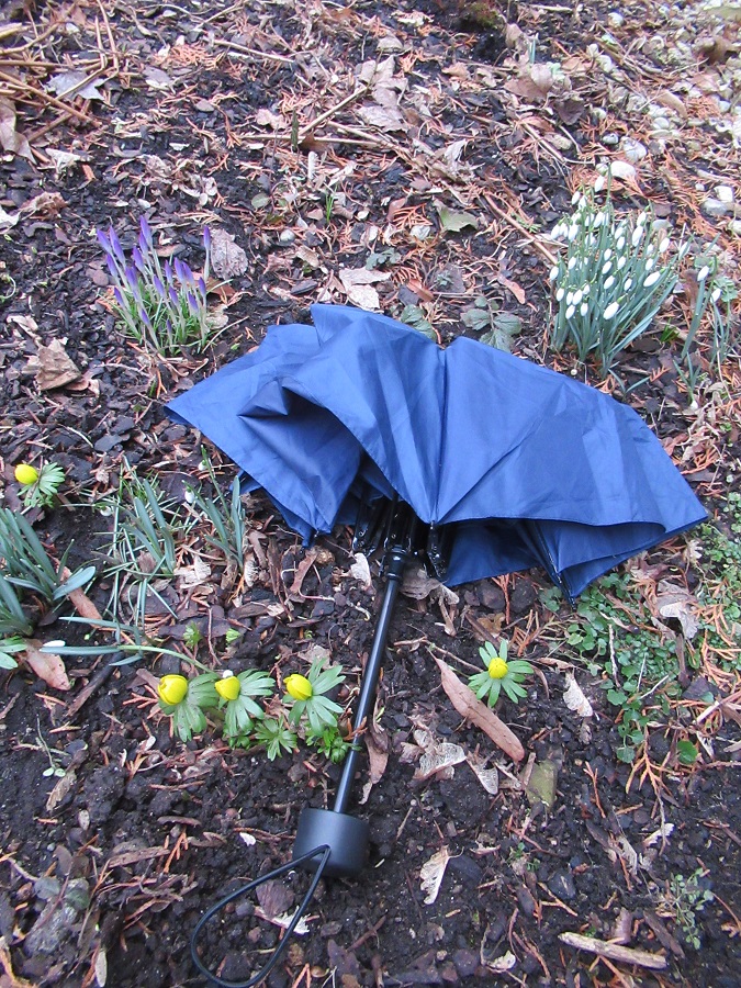 Silber-Distel Re: Challenge 02/2019 • I'm singing in the rain!Es war ein anstrengender Tag dachte der Schirm, klappte zusammen, legte sich zwischen die ersten Frühlingsboten und träumte.....