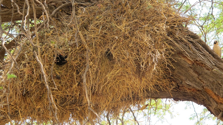 Re: Challenge 10/2016 • Schau nach oben!Hier ein Webernest und seine "Bauherren", aufgenommen in der Kalahari Desert Lodge in Namibia