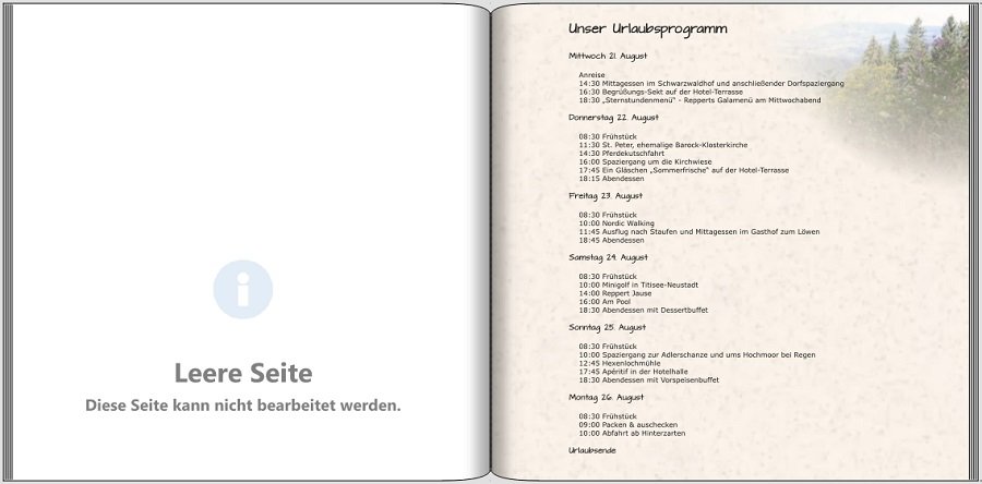 Danach gab es immer ein Fotobuch zum Erinnern. Auf der vorderen Seite hat das Urlaubsprogramm Platz gefunden und die letzte Seite war immer der "Lumpensammler" für Fotos, die es nicht ins Buch geschafft haben.