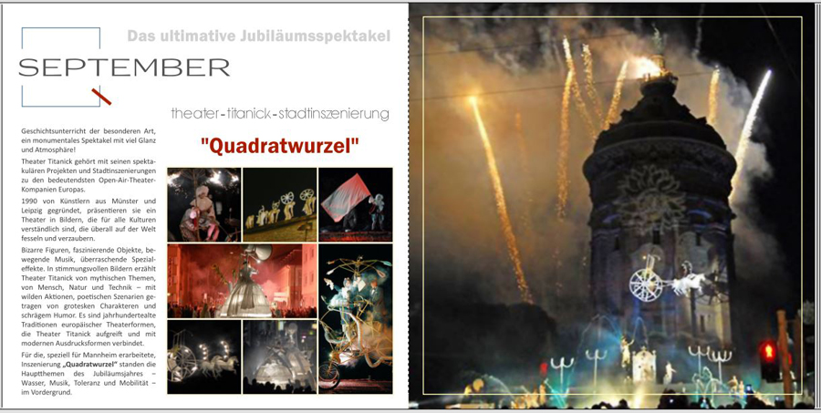 Dieses Werk musste jetzt auf jeden Fall noch sein, da ich diese Veranstaltung so grandios fand. Mannheim hat sein 400jähriges Bestehen ein ganzes Jahr lang mit sehr vielen verschiedenen Veranstaltungen gefeiert. Die beiden Veranstaltungen, die ich hier vorstelle, waren die Highlights des Jahres. Ist das tatsächlich schon so lange her? Ich kann es kaum glauben, es ist in meiner Erinnerung so lebendig, als wäre es gestern erst gewesen. So besonders, so bildgewaltig und eindrucksvoll! Und da es ein Magazin von Mannheim der "Quadratestadt" ist, ist das quadratische Format geradezu ein MUSS! Liebe Grüße