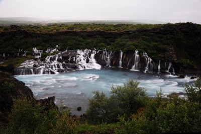 ein Bild vom Hraunfossar in Island. Der Fluss Hvita muss sich ein km oberhalb unter einer schwarzen Lavadecke durchbohren und kommt dann schleierartig heraus. Es war schon fast dunkel und neblig, als wir ankamen. Stativ und Graufilter.