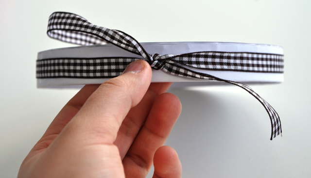 Passend zu Ihrem Motiv können Sie Schleifenband um den Deckel binden, um der Box mehr Lebendigkeit zu verleihen. Bevor Sie das Band jedoch an der Box befestigen, messen Sie es aus, in dem Sie es zum Beispiel locker um den Deckel legen.