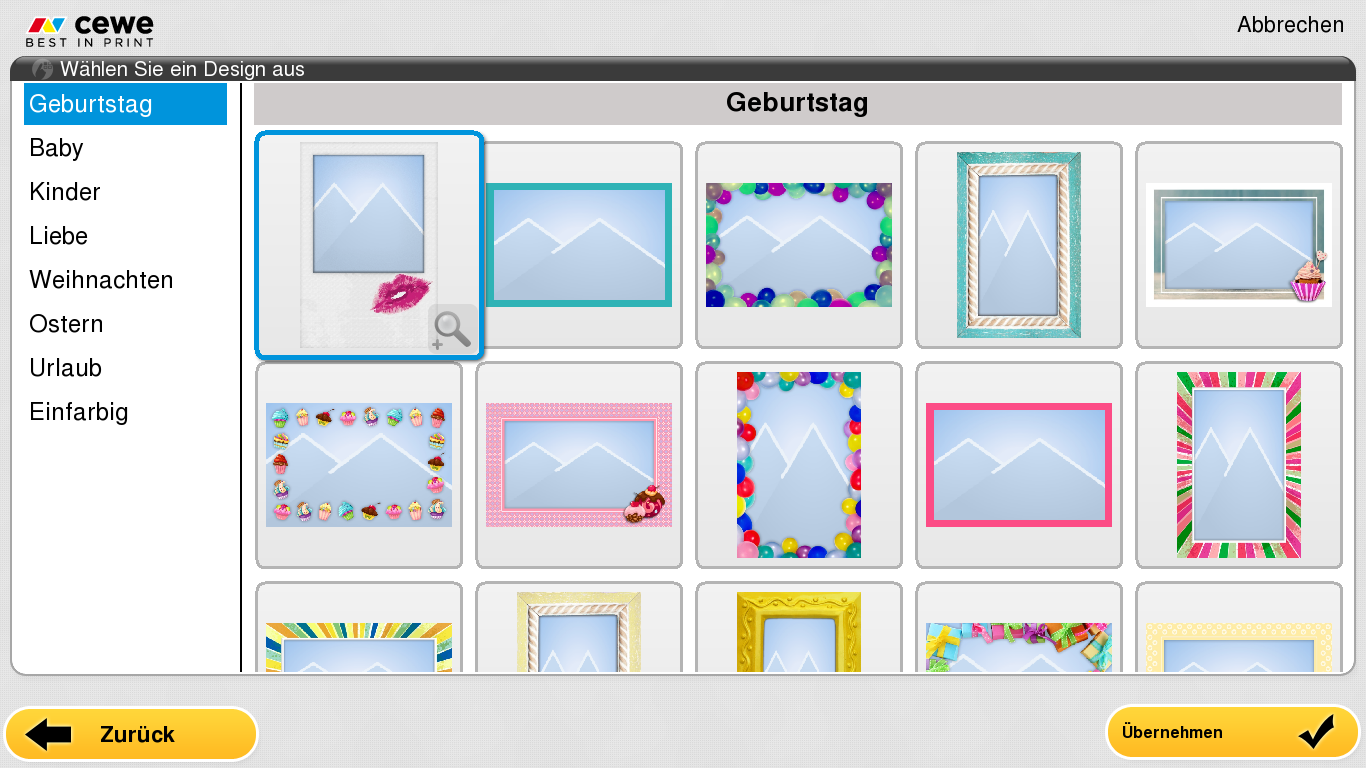Entscheiden Sie sich in dem Startmenü für das Produkt „Fotos mit Rahmen“ suchen Sie Ihr gewünschtes Bild aus und probieren Sie die unterschiedlichen Rahmen durch. Zwischen Muscheln und Muffins finden Sie bestimmt den Rahmen, der Ihr Motiv unterstreicht.