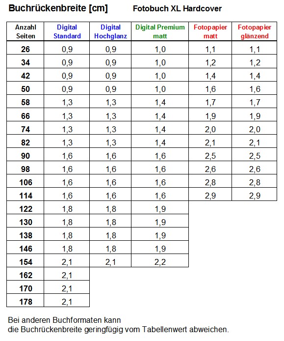 Für andere Seitenzahlen und Papiertypen ist die Buchrückenbreite folgender Tabelle zu entnehmen: