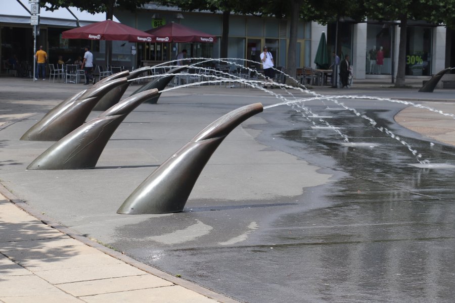 Die Wasserspeier sind in den Königsplatz in Kassel eingebaut, aufgenommen wurde es am 03.07. bei angenehmen 35 Grad im Schatten Was allerdings am lustigsten war: Am Rand des Platzes befindet sich ein Fachgeschäft für Herrenhuter Weihnachtssterne, mit voll illuminierten Schaufenster. Ich war fast versucht, „Leise rieselt der Schnee“ anzustimmen