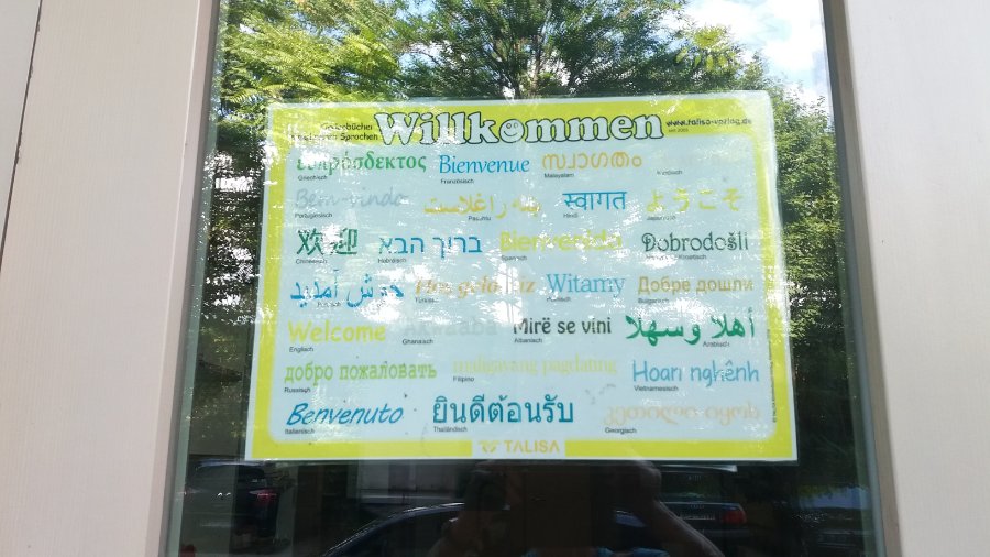 Hier das Plakat am humanistischen Kindergarten. Willkommen in unterschiedlichen Sprachen. Welche dies ist steht immer darunter. Leider waren die Lichtverhältnisse fürs fotografiere etwas zu schlecht. Liebe Grüße Asiafan