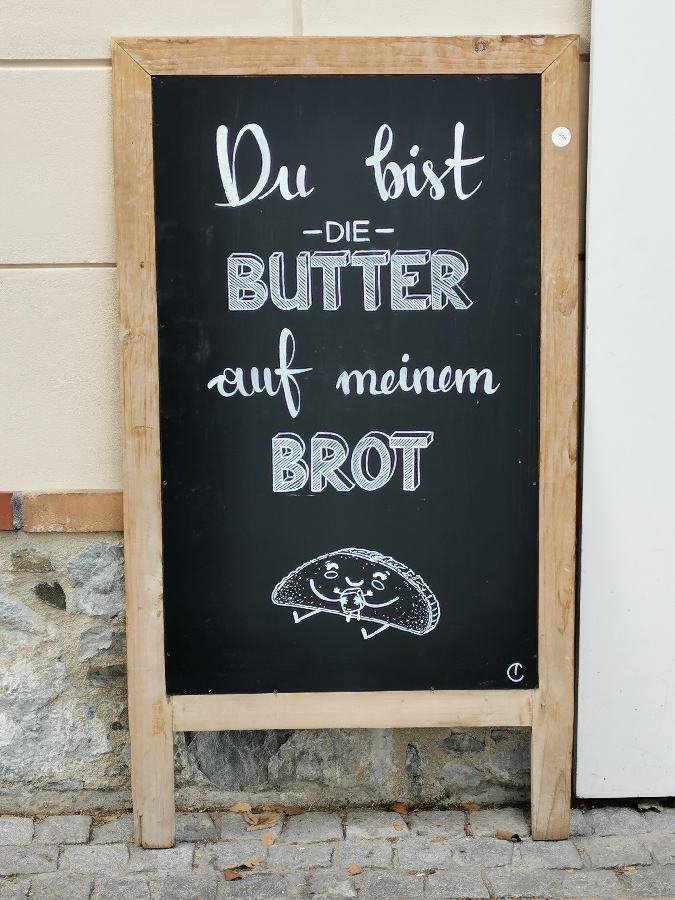 Kunigunde Re: Foto-Aufgabe September: ABC - Typografie, die auffälltZwei handgeschriebene Tafeln vor einer Bäckerei.