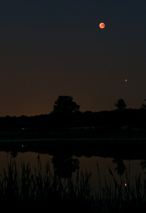 wir dachten schon, der Mond hat sichs anders überlegt und ist umgekehrt. Oder: Mondfinsternis heißt: der Mond ist finster. Er kam und kam nicht. Dann - ein Verdacht - ist da ein blasser rosa Fleck im Osten, im dem ganzen Dunst? Ja, tatsächlich, es gibt doch einen Mond, und der Mars hängt drunter: Viele Grüße - Gletscherfrau
