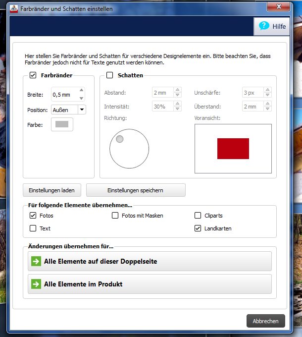 caterine, wenn du Farbränder und Schatten nicht wegschalten kannst, dann habe ich als erstes die Vermutung, dass du noch - im mittleren Teil des Dialogs, den du in deinem Beitrag zeigst - bei Fotos mit Masken ein Häkchen machen musst.