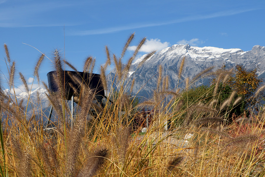 Re: Challenge 10/2016 • Schau nach oben!Gestern in Wattens bei Swarovski. Ich schaue nach oben auf eine Aussichtsplattform (mit Fernrohr, das leider verdeckt ist) und dahinter die herrlichetiroler Bergwelt.