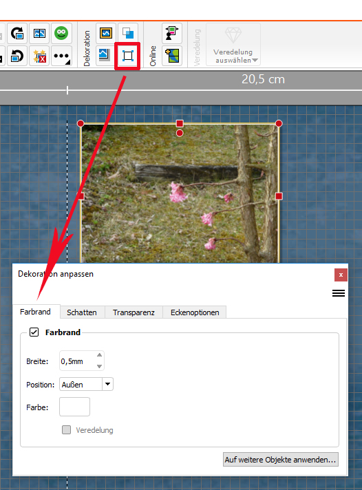 Du musst einfach den rot umrahmten Button aktivieren und kannst Rahmen, Schatten, Transparenzen und Eckoptionen ganz nach Wunsch einstellen und diese Einstellung kannst Du dort auch speichern, wenn Du sie vorwiegend verwenden möchtest. In diesem Menü kannst Du rechts oben (drei Striche) Einstellungen speichern. Gutes Gelingen! Liebe Grüße