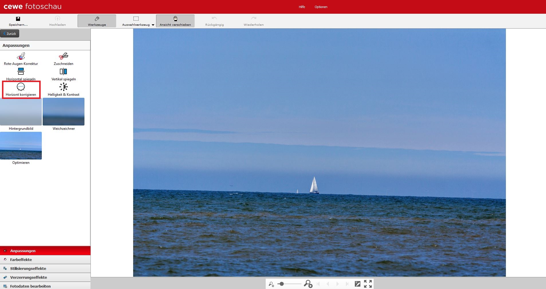 Durch einen Doppelklick auf das Bild gelangen Sie in unsere CEWE FOTOSCHAU. Unter der ersten Kategorie „Anpassungen“ finden Sie links die Option „Horizont korrigieren“.