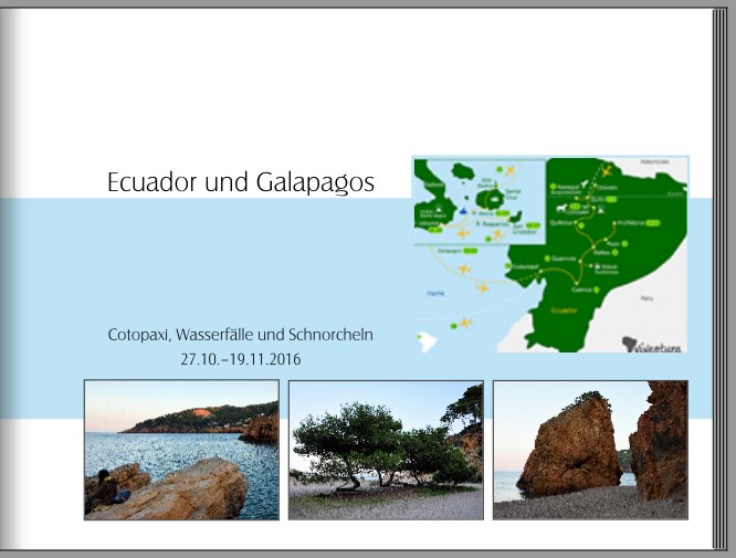 die Grundidee deiner ersten Seite ist schön. Ich kann sie mir sowohl mit als auch ohne Fotos vorstellen. Ich habe einige Varianten ausprobiert, die vielleicht eine Anregung für dich sind. Den blauen Streifen bzw. ein blaues Feld habe ich beibehalten. Die Schrift habe ich ausgetauscht und eine "leichtere" gewählt. Schau mal, wie es dir gefällt. Für deine Titelseite habe ich auch noch einen Vorschlag. Wie findest du diese etwas lockerere Gestaltung? Mir gefällt sie mit dem blauen Feld gut, ich könnte sie mir aber auch ohne vorstellen. Ich frage mich, ob die gewählten Fotos das zeigen, was Ecuador und Galapagos für dich ausmachen? Oder gäbe es (für Ecuador) ein treffenderes? liebe Grüße