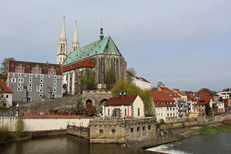Das Bild zeigt die östlichste Gaststätte Deutschlands, die Vierraden-Mühle in der Lausitzer Neisse bei Görlitz. Hinter der Mühle ist die Pfarrkirche St. Peter und Paul zu sehen. Aufgenommen wurde das Bild von der polnischen Neisse-Seite aus, was nicht zu sehen ist: Rechts neben mir befindet sich ebenfalls ein Gasthaus, dass (wie das deutsche) in seinem Biergarten einen Grenzpfahl hat. Man kann also wahlweise in Deutschland gut essen oder in Polen, der Fussweg ist wohl gerade 50 Meter. Allerdings werden beide Lokale, die Vierraden-Mühle in Deutschland und die Dreiraden-Mühle in Polen, von polnischen Wirten betrieben