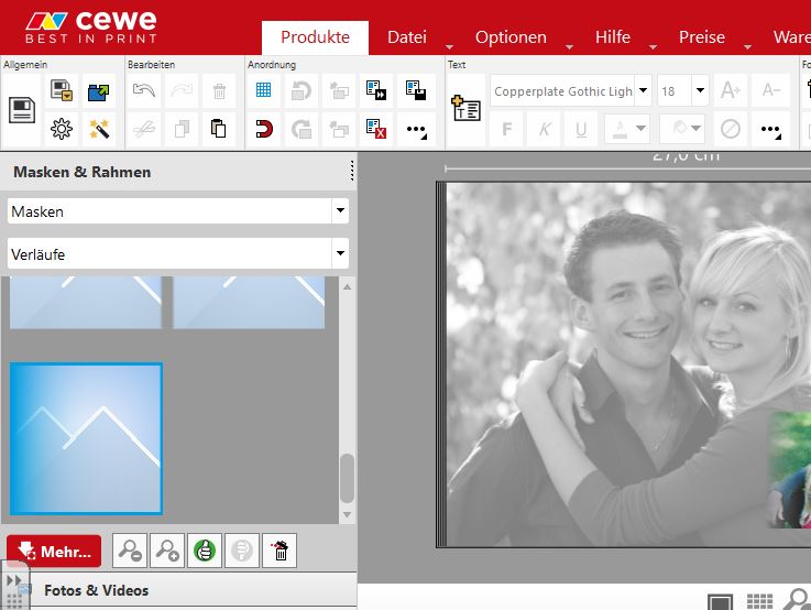Die kleineren Fotos habe ich im unteren Drittel der Doppelseite aneinandergereiht und das Foto ganz links mit einer Maske versehen, um es mit dem Hintergundfoto verlaufen zu lassen. Die Maske habe ich per "Mehr" Button heruntergeladen, da sie nicht in der Standardmasken vorhanden war.