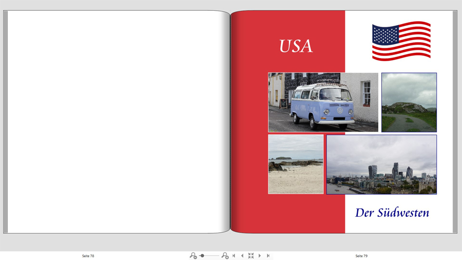 Liegt dir sehr viel an diesem Foto? Wenn nicht, würde ich es ganz weglassen. Der Brunnen ist mittig, da würde ich zumindest unten was wegschneiden. Wurde es aus einem 4k Video ausgeschnitten? Wenn nicht, wird es vielleicht doch etwas zu pixelig, was bei schwarz mehr auffällt als bei einer Landschaft.--------------------------------------------------- Re: Kreative BlockadeDem Vorschlag von Rotuma schließe ich mich an, außerdem würde ich dem Foto keinen weißen, sondern einen goldfarbenen Rahmen geben, den du mit dem Farbpicker aus einem Farbton des Fotos einfärben kannst. Schau dir auch nochmal genau deine erste Innenseite an. Die Abstände der Fotos scheinen nicht korrekt ausgerichtet zu sein. Es kommt mir auch vor, als wären die in der linken Spalte angeordneten Fotos in der Breite etwas schmaler als die rechten. Das kannst du ganz einfach mit dem Hilfsgitter überprüfen und korrigieren. Ansonsten gefällt mir die erste Seite sehr gut. Das Cover wäre mir persönlich zu voll, ist aber Geschmacksache. Die Schräge im Hintergrund gefällt mir sehr gut!