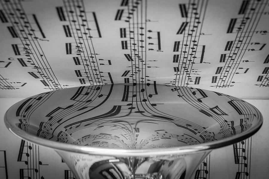 Ein Notenblatt spiegelt sich darin und zeigt interessante Muster.
