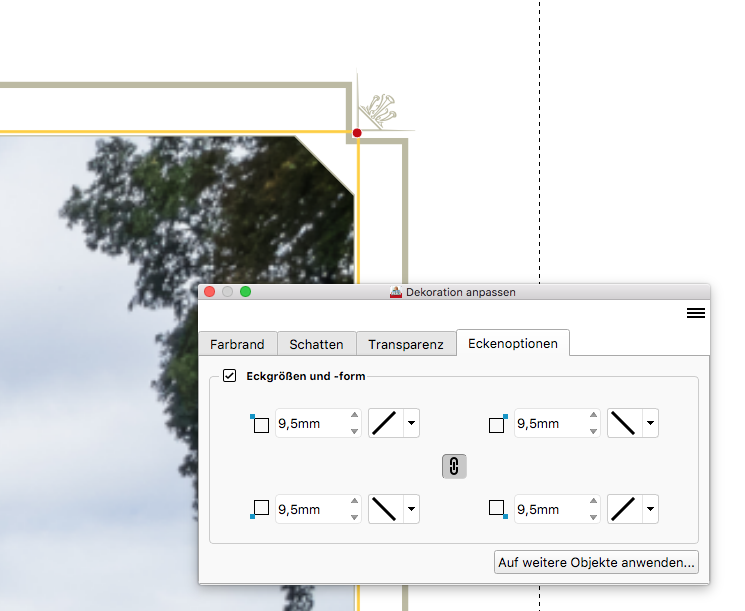 entschuldige, dass ich mich so spät melde. Dafür gibts aber jetzt auch Screenshots zur Erklärung Also: das Foto in der Mitte ist mit der Eckenoption zurechtgeschnitten (s. Bild 1). Darunter liegt ein weißes Foto mit Rahmen, wieder mit Eckenoption (Bild 2). Die Deko in der Ecke ist das "D" aus der Schrift CornPop (Bild 3). Gibts wie immer kostenlos auf meiner favorisierten Internetseite Dafont.com. Den Buchstaben habe ich gedreht, so dass er in die Form passt. Das Drehen geht bekanntlich über den roten Punkt. Wenn man die Maus vom roten Punkt wegzieht, kann man den Winkel mühelos bestimmen- je weiter weg desto einfacher geht es. Und das ist der ganze Zauber. Gar nicht so schwer. Viel Spaß beim Nachbauen. Liebe Silber-Distel, du hast völlig Recht. Mit meinem Augenmaß scheint es nicht so weit her zu sein. Also werde ich zum Schluss nochmal ein Raster über die Seiten legen und alles schön ausrichten. Stööööhn. Aber es soll ja auch gut aussehen. Vielen Dank für das aufmerksame Betrachten und den Hinweis. Liebe Grüße an euch alle! Heut ist wieder Fußball, also eine gute Gelegenheit für einen schönen Abendspaziergang ohne Radler und ungestörtes Fotobuchgestalten. Re: Gestalten mit Rahmen und DingbatsLiebe Hellen,