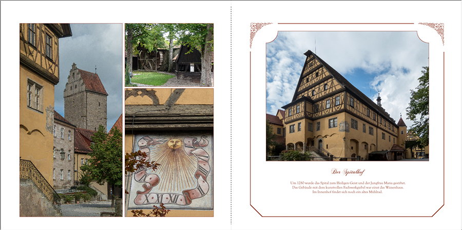 toll, dass Du uns wieder ein paar Seiten zeigst. Ich finde die Gestaltung wunderbar zurückhaltend und hervorragend und passend zum Stil der gezeigten historischen Stadtansichten. Mir sind Kleinigkeiten aufgefallen. Text: Du hast das richtige Händchen für die Schriftwahl und den hier angenehmen Mittelachsensatz. Großartig. Auf der Dinkelsbühlseite ist mir die Satzbreite nach unten hin zu breit. Inhaltlich liest es sich fast wie eine Aufzählung. Ich würde es zur Auflockerung daher stilistisch fließender umbrechen und optisch mit abwechselnd kurzen und langen Zeilenlängen versuchen. Fotoecken: Deine Ideen und die Umsetzungen sind genial. Bei manchen Ecken „ecken“ mein Augen an: immer dann, wenn die Achsen von Foto und Rahmen nicht symmetrisch ausgerichtet sind. Ich zeige Dir, was ich ändern würde, am Beispiel Spitalhof: Könntest Du Dir vorstellen, dass auf dieser Seite die unteren, äußeren Ecken der beiden Wappenfotos ebenfalls abgeschnitten sind und zwar genauso wie beim Rahmen des darunter stehenden Textfeldes? Ausrichtungen: Dazu hatte Dir Silberdistel Tipps gegeben. Kann es sein, dass auf der Dinkelsbühlseite die Abbildungen unten nicht auf einer Höhe sind? P.S. Ich gucke gerade Fußball. Lieber Gruß, pitty