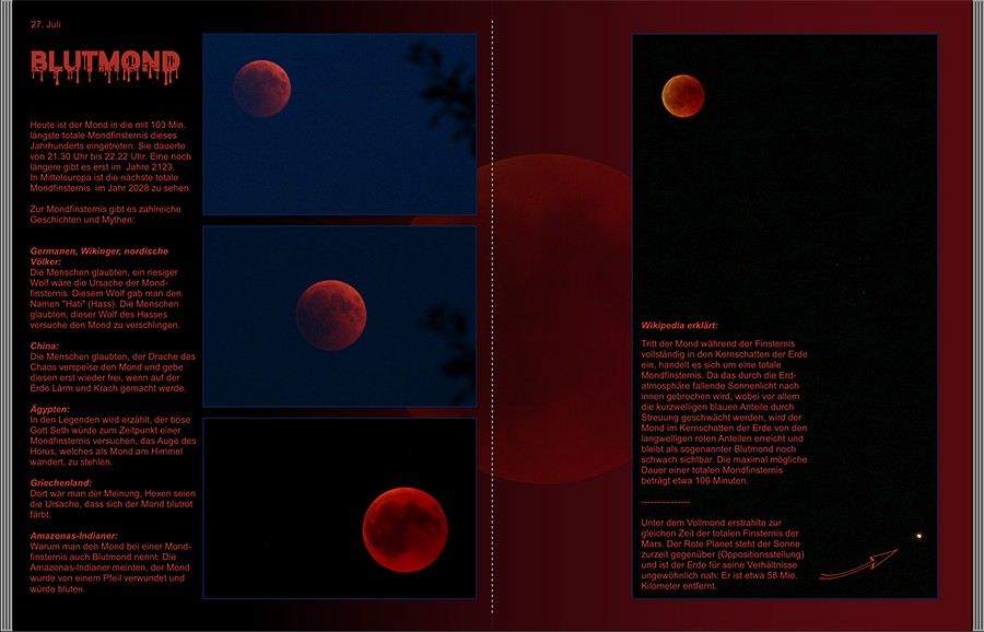Re: MondfinsternisDanke für die Anregungen, ich werde mich heute Nachmittag nochmal dransetzen. Die Textfelder an sich sind links und rechts gleich breit. Das Foto mit Mond und Mars und dem schwarzen Himmel rechts habe ich in der Größe so angepasst, dass beide Himmelskörper gut zu sehen sind. Ich könnte es aber noch ein wenig schmaler machen und etwas weniger zoomen, dann würde der Mond aber weiter nach unten rutschen. Das ganze Foto mit Text könnte ich noch weiter an den Außenrand setzen. Sollte ich den Text rechtsbündig neben den Mond setzen? Ich lasse es jetzt mal so stehen und spiele gelegentlich noch ein bisschen rum.