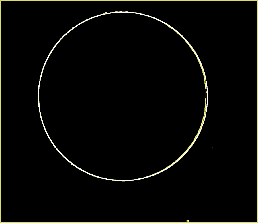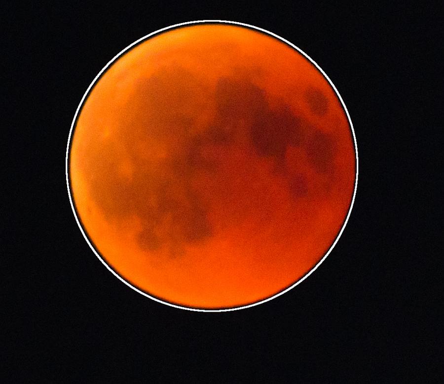Ich habe mal ganz genau hingeschaut, aber ich kann keine Abweichung sehen. Kann aber an meinen Augen liegen Ich habe in gimp eine kreisrunde Auswahl um den Mond aufgezogen und weiß umrandet. Da ich mir unsicher mit dem Ergebnis war, habe ich zum genaueren Vergleich beim hellen Mond eine Auswahl aus der schwarzen Umgebung erzeugt und gelb umrandet. Hier sehe ich keine Abweichung (bis auf den rechten Rand, wo der Mond noch zu schwarz war und in die Auswahl einbezogen wurde). Was meinst du? Siehst du hier auch noch eine Delle? Danke übrigens für deinen Hinweis. So genau wie heute habe ich die Bilder bisher nämlich gar nicht beurteilt, vor lauter Begeisterung über das Schauspiel liebe Grüße