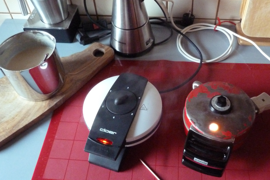 Re: Challenge 01/2019 • Mehlige AngelegenheitGebacken wird im "Stereoverfahren" mit zwei Eisen. Das rechte Eisen ist schon über 40 Jahre alt, die Farbe ist schon abgeblättert, es funktioniert aber einwandfrei und bäckt gleichmäßiger als das neue linke Gerät.