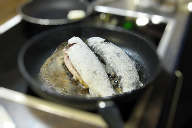 Mein Bild zeigt zwei Forellen, die in heißer Butter gebraten werden, schön knusprig dank der leichten Mehlhülle. Gebratene Forellen essen wir seit vielen traditionell am Heiligabend und Silvester. Wenn sie fertig sind, wird der Bauch der Fische mit gerösteten Mandeln gefüllt. Dazu gibt es Fenchel-Orangen-Salat und Baguette. LG Bäuerin