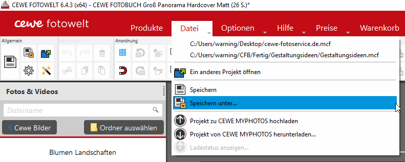 ich freue mich, dass Sie Ihre Projektdaten gefunden haben. Ihre Anmerkungen sind mir noch nicht klar. Mit der Funktion "Speichern unter" können Sie Ihre Daten nur lokal speichern. Ein Upload zu cewe myphotos ist an dieser Stelle nicht möglich. Dafür gibt es eigens die Funktion "Projekt zu cewe myphotos hochladen". Meinen Sie diesen Punkt? Sylke Re: Suche nach meiner GrußkarteDann habe ich das 'Speichern unter' wohl falsch verstanden - ich dachte, dass es dann auf dem Portal gespeichert wird.