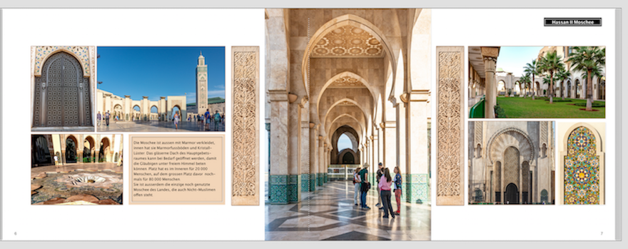 Re: Mit oder ohne Hintergrund?Bei der gewählten Seite finde ich beide Varianten schön, denn das zarte Beige passt zu den Erdtönen. Aber Marokko lebt ja vom Farbenreichtum. Du hast sicher auch Seiten, die wesentlich bunter sind. Dort würde das Beige dann wirklich die Buntheit wegnehmen. Im Zweifel würde ich weiß nehmen, evtl. eine Farbe aus der Seite aufnehmen und einen Akzent im Hintergrund setzen.