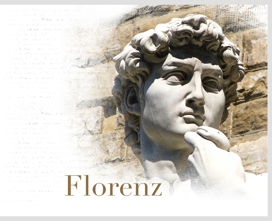Die Didot ist wegen der "altertümlichen" Serifen sehr passend. (Außerdem wäre es Schade, den exquisiten Font nun nicht zu nutzen, wenn Du ihn schon erstanden hast.)Ich finde keinen plausiblen Grund, Florenz in Großbuchstaben zu schreiben. Die Didot-Gemeinen sind ebenso wunderschön. Was veranlasst Dich, eine so besondere Anordnung der Headline und so große und zudem variierende Größen in Konkurrenz zum David zu setzen? Ich lese und grüble: Flo renz. Meine "klassische" Idee: waagerechte "normale" Ausrichtung in dunklem, warmen Braun (oder veredeltem Gold) und viel, viel kleiner und in gemischter Schreibweise; Position: unten links am Hals. Ich bin gespannt auf Deine Lösung. Lieber Gruß, pitty