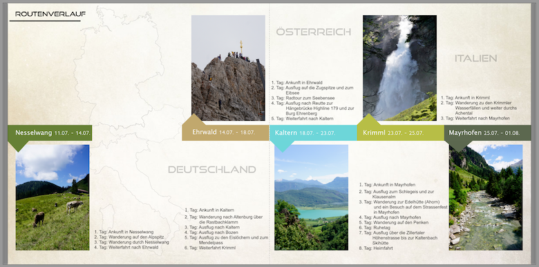(Die Kreise sind mir dann doch zu unruhig.) An den Textumbrüchen würde ich noch ein bisschen zupfen, damit sich die Etappen hier jeweils nicht so nahe kommen. Ehrwald 2. Tag, Zeilenumbruch nach "und" 4. Tag, Zeilenumbruch nach "und" Kaltern 5. Tag, Zeilenumbruch nach "und" In den jeweils folgenden Zeilen ist noch genug Platz, um hier die zusätzlichen Wörtchen noch unterzubringen. Liebe Grüße
