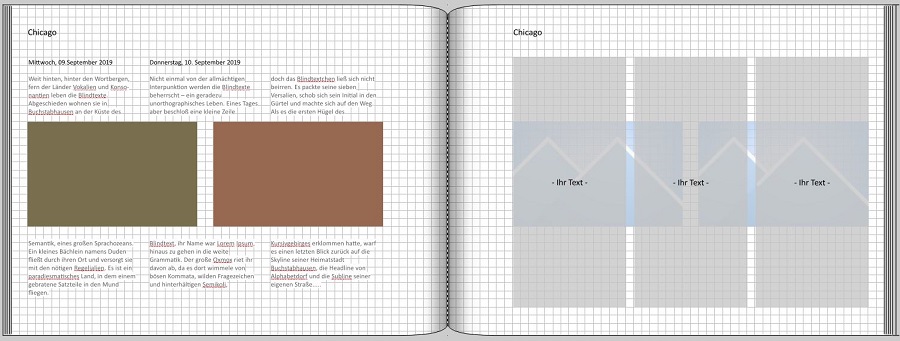 Text in Spalten umwandeln analog zu Word ist in der cewe-Software nicht möglich. Du kannst aber gleichgroße/-breite Textfelder nebeneinander anlegen, in dem Du z.B. auch das Raster (und die Magnetfunktion) nutzt. Derzeit kann ich mich inhaltlich gar nicht so recht auf Deinen Text konzentrieren, weil ich Anordnung und somit Lesereihenfolge nicht intuitiv finde. Normalerweise lese ich Spalte für Spalte von oben nach unten. Wenn ich es richtig herausgefunden habe, schreibst Du jedoch von links nach rechts und erst danach von oben nach unten. Das macht die inhaltliche Zuordnung schwer. Ich habe beim ersten Lesen z.B. nicht verstanden, wieso kurz nach 9:00 Uhr schon spät ist, sodass Ihr ins Hotel zurückkehrt... Die Bilder würde ich aneinander ausrichten und auch gleichhoch gestalten. Derzeit liegen sie nur ungenau auf den Seiten. Auch würde ich den Text so setzen bzw. schreiben, dass er nicht im Bild endet. Das finde ich immer schade für die Wirkung eines Bildes. Wenn Du die Textfelder neu setzt, schau einmal, wie der Text dann optisch wirkt und auf die Seite passt. Jeder mag sich an andere Dinge aus seinem Urlaub erinnern, aber ich würde wohl auf das Notieren von Ziehen von Parktickets oder Kauf von Schiffstickets verzichten und dafür persönlicheren Erinnerungen und Anekdoten sowie den Bildern mehr Raum geben. Ich hoffe, dies hilft Dir vielleicht schon etwas weiter. Viel Spaß beim weiteren Gestalten! EDIT: Es hat sich offenbar ein Datumsfehler eingeschlichen. 09.09. und 10.10.? Und dann hast Du derzeit noch Markierungen (Fettschrift und Unterstreichungen) im Text, die mir ungewollt erscheinen. Ich stelle gleich noch ein Bild für meinen Vorschlag des Seitenaufbaus ein. Also: Fortsetzung folgt... Liebe Grüße