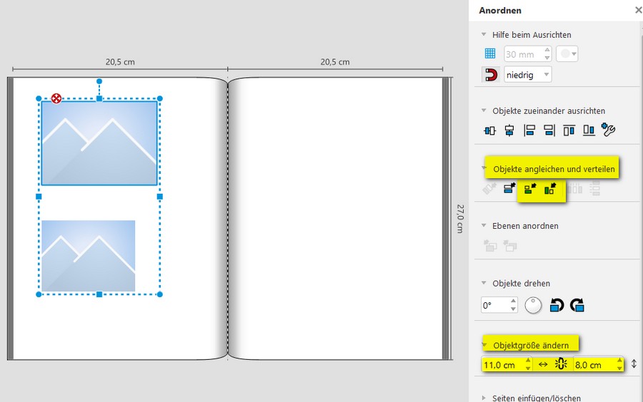 Entweder Objektgröße in Höhe und Breite angleichen (das Foto mit der gewünschten Größe muss zuerst markiert werden). ... oder direkte Eingabe der Breite und Höhe bei Objektgröße ändern Wer ist online?Mitglieder in diesem Forum: Google [Bot] und 66 Gäste